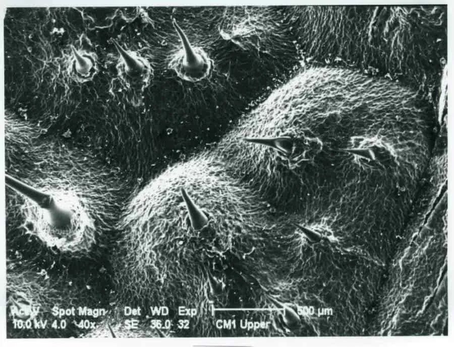 毛状体的顶部是一个球状结构,只要触碰到物体它就会瞬间脱落,露出非常锋利的尖头,这个尖头非常细,但是它比较坚硬,足够刺穿皮肤[1]。