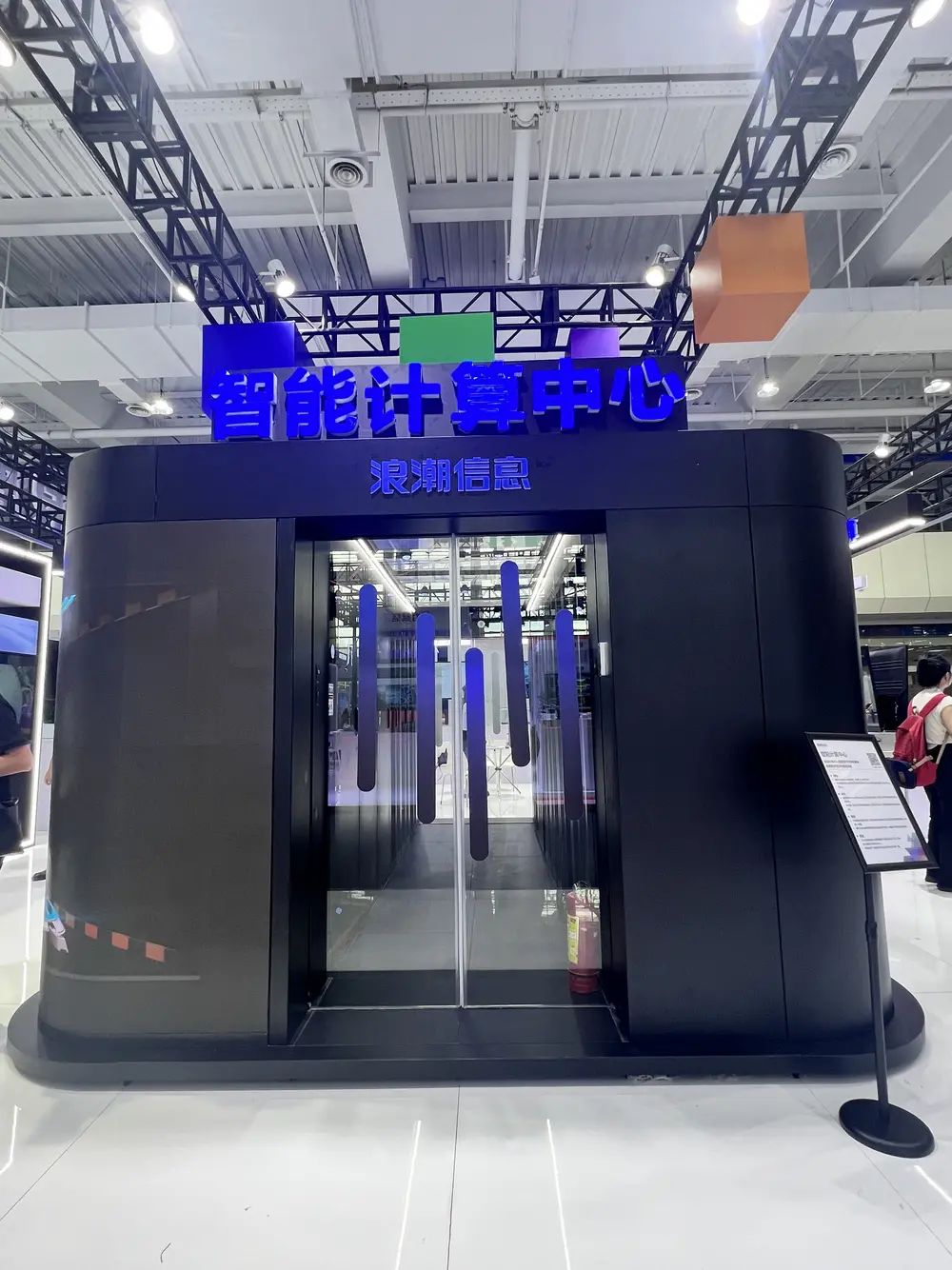 距离中科曙光不远处,是浪潮信息展台,一个硕大的全液冷机柜放置在进场显眼处,这种布陈,很难不被看到。