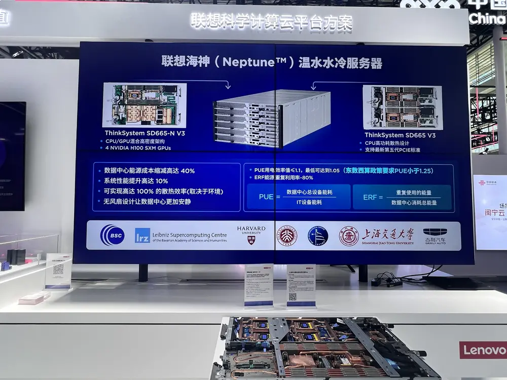 联想现场工人员介绍,海神温水水冷技术能够优化算力产品的性能、密度和能源消耗,将热量从 CPU、GPU、存储等和核心发热部件直接排出系统,比传统的空气散热更高效、更便宜,相比于其他水冷技术也独具优势。对比传统风冷技术能够节约高达40%的电力成本,可将数据中心PUE降低至1.1以下。