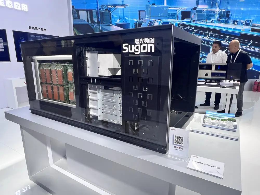 现场人员向《科创板日报》记者介绍,这种液体是氟化液,其沸点较低,通过遇热气化将设备内部的CPU、内存、电源系统等发热部件产生的热量转移出IT设备,再与水做热交换,最终将热量排出,以达到良好的降温节能效果。