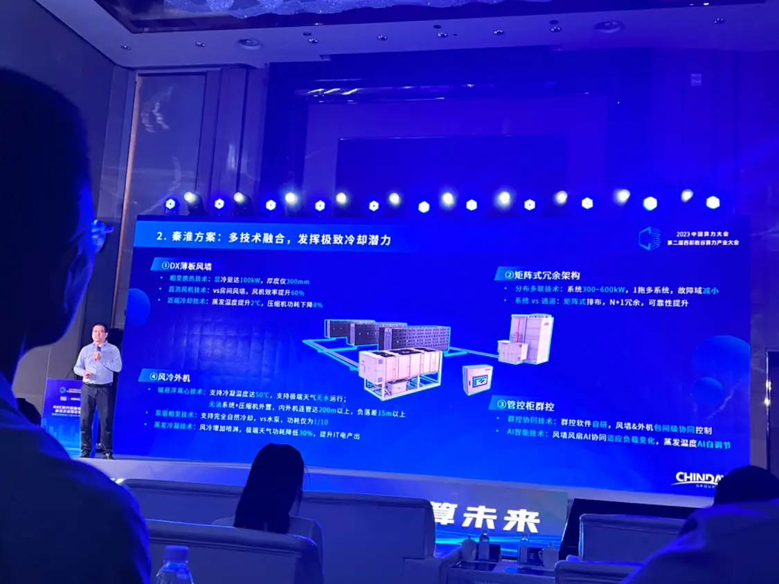 除直接产品展示外,一些厂商也选择在论坛上发布相关产品。比如,在18日下午举行的AIGC时代数据中心新技术发展论坛,秦淮数据发布了AIGC新一代数据中心全栈解决方案,其中主要产品之一就是降温的“玄冰”磁悬浮相变冷却系统。
