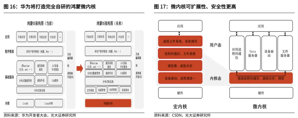 鸿蒙和Android都是微内核架构,只保留最核心的功能(如基础进程间通信、虚拟内存等),并将部分非核心功能(如文件系统、设备驱动等)从内核中剥离出来并使其模块化,从而让不同的设备可以按需调用功能模块,相较宏内核更灵活。