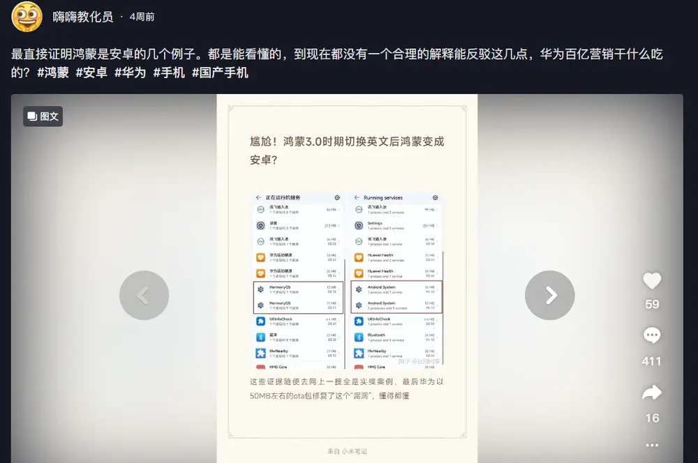 曾有网友在手机端升级鸿蒙3.0,将系统语言换成英文后,正在运行的服务中“HarmonyOS”显示为“Android system”,直至今日还有不少网友用这个截图佐证华为鸿蒙套壳。
