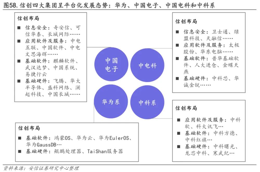 在多方推动下,我国信创产业技术和产品生态体系已初步成型,信息技术产品可满足部分关键领域和重要信息系统最基本的应用需求,基本具备替代Wintel体系的能力。这其中,最具代表性的当属中国电子、中国电科、中科院和华为四大信创生态体系。