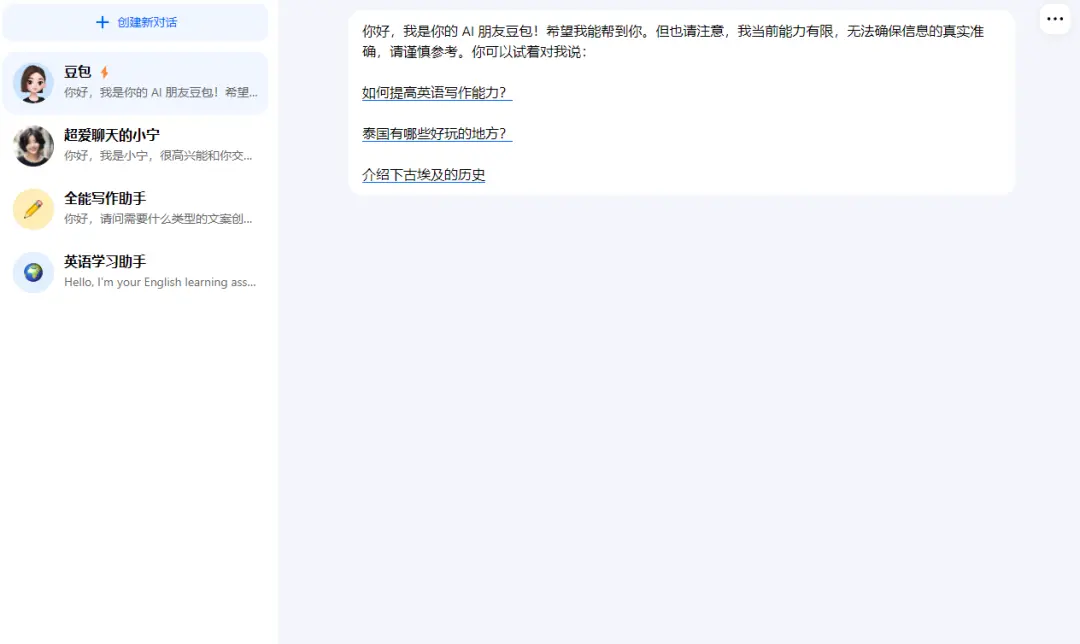 除了豆包,字节跳动还提供“超爱聊天的小宁”“英语学习助手”“全能写作助手”三个不同的AI对话角色。仅从文字描述,基本上就能猜到三个角色各自的特点,比如“超爱聊天的小宁”相较于豆包更有“人情味”,回答并不会追求准确性,而是更注重于趣味性。