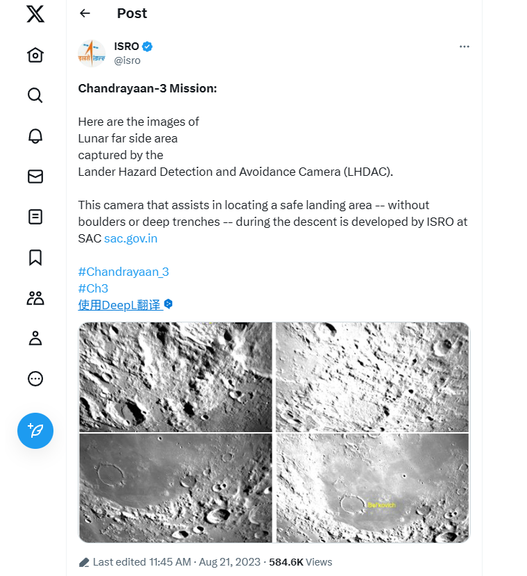 印度7月14日发射的月船三号,历经波折,已于8月5日进入月球轨道,而现在印度空间研究组织(ISRC)公布了“月船三号”拍摄月球表面图像。