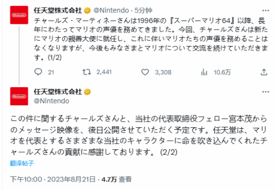 任天堂感谢查尔斯为许多角色(尤其是马里奥)做出了贡献,之后将发布查尔斯和宫本茂关于此事的视频信息。