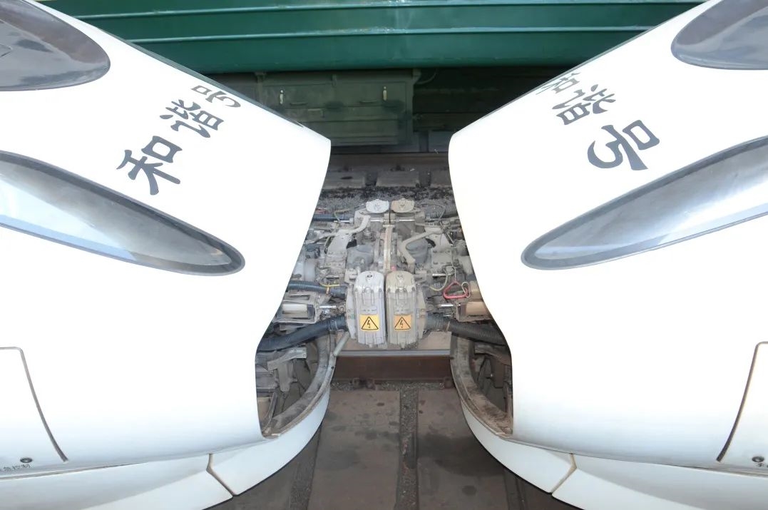 据了解,动车组不仅是机械方面的重联,电路、电气都需相互连接,这样才能实现统一控制。因此,两列动车组需为同型号短编组,我国动车组重联采取“8+8”的编组方式,不同型号的两列动车组是不能连接在一起的。