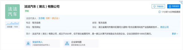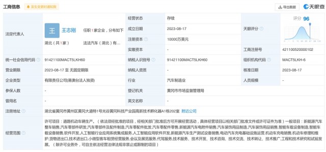 据天眼查APP显示,法法汽车(湖北)有限公司于近日成立,法定代表人为王志刚,注册资本1亿美元,经营范围含道路机动车辆生产、新能源汽车整车销售、汽车零部件研发、智能车载设备制造、人工智能行业应用系统集成服务、代驾服务、工程和技术研究和试验发展等。