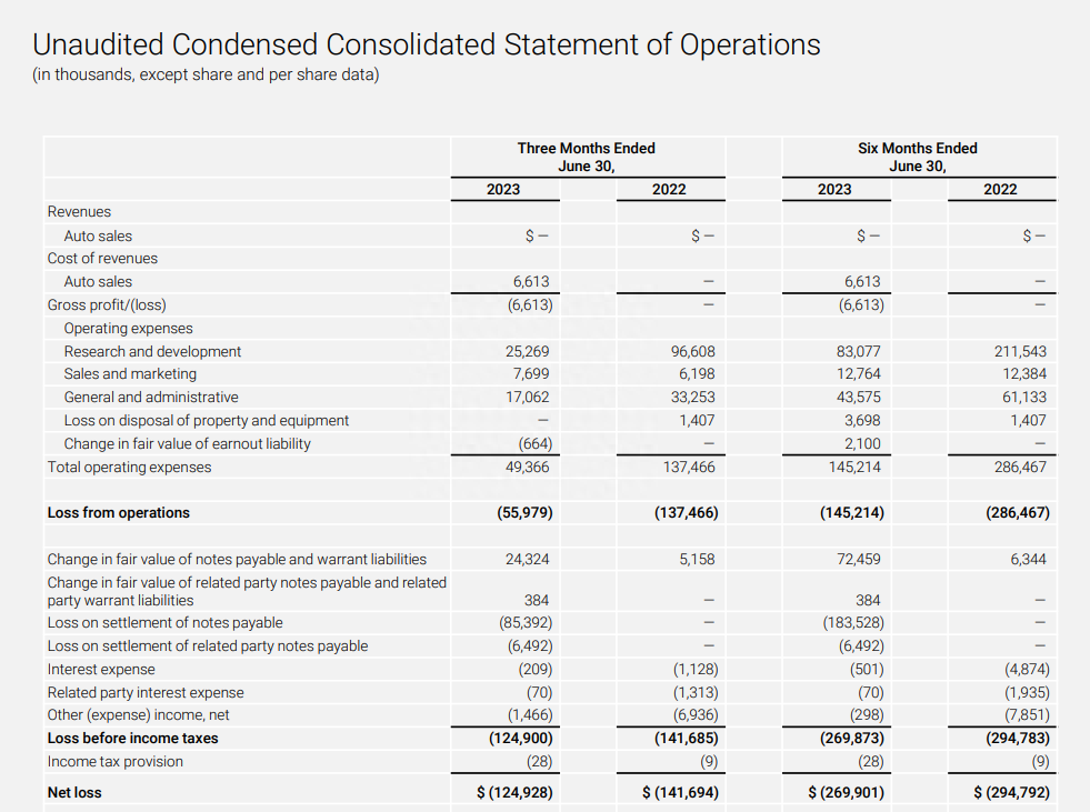在这份财报中,可以看到汽车销售收入一栏中没有数据,大家最为关注的营收方面,FF避之不谈。反而在汽车收入成本上投入了661.3万美元,这也导致报表中的毛利显示亏损661.3万美元。