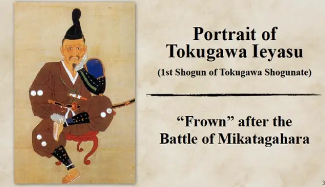 孙正义在去年的软银集团财报发布会上展出的颦像。图为德川家康在轻敌冒进吃了生平唯一的败仗( 三方原合战 )之后,命画师将自己狼狈逃窜的样子记录下来,用以自警