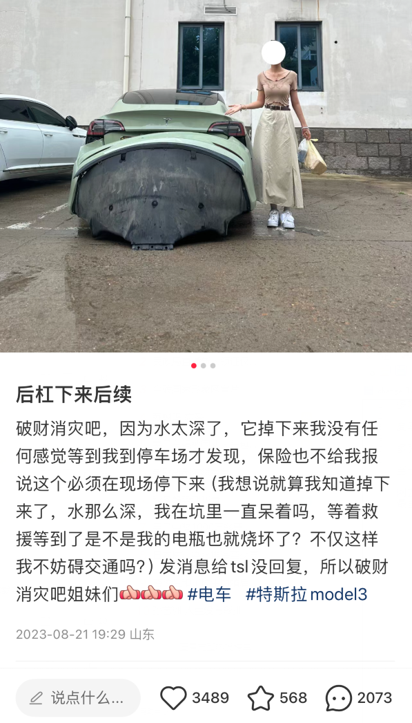 网友分析,这是特斯拉的设计缺陷。油车因为后边要安排排气管,没办法做成一体封闭式的,电车主要看怎么设计,至少目前爆出来的最多的是特斯拉。