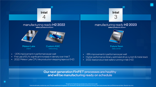 下个月的创新大会上,Intel将会发布新一代酷睿Ultra处理器,代号Meteor Lake,首发Intel 4工艺,这是Intel第一代EUV光刻工艺,变化很大。根据Intel之前所说,Intel 4工艺的其晶体管的每瓦性能将比现在用的Intel 7提高约20%,后续改进版的Intel 3会在Intel 4基础上再次实现每瓦性能上实现约18%的提升。