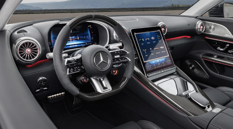进入车内,全新的AMG GT采用了全新“超模拟”座舱概念所打造的,首搭2+2座椅布局,整体设计以驾驶者为中心,中间搭载了11.9英寸的触摸屏,并搭载了全液晶仪表屏。