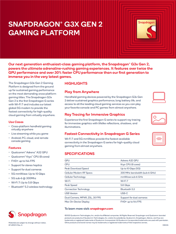 据了解,第二代骁龙G3x平台是旗舰级骁龙G3系列最新产品,采用8核Kryo CPU、Adreno A32 GPU,与前代平台相比,CPU性能提升超30%,GPU性能翻倍。