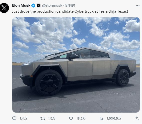 这应该就是最终定型的Cybertruck。马斯克在社交媒体推特上发布了其中一辆量产候选版Cybertruck的照片,并宣布,“刚刚在特斯拉得州超级车展上试驾了一辆Cybertruck!”