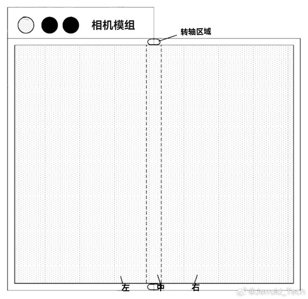该博主放出了这款折叠屏手机的各个视图。从展开状态下的主视图来看,相机模组置于屏幕左半区域的上部,充当展开状态下的前摄、折叠状态下的后摄。