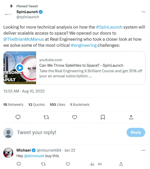 对比SpaceX,Spin Launch受外界的关注可谓旗鼓相当,连网友都在Spin Launch的官方Twitter下调侃道,“嘿!马斯克,买这个!”