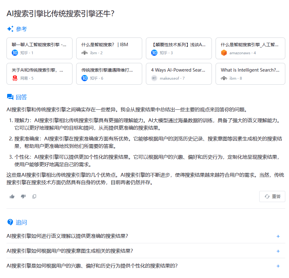 更重要的是,它有着传统搜索引擎不具备的整合信息和提炼资料的能力。