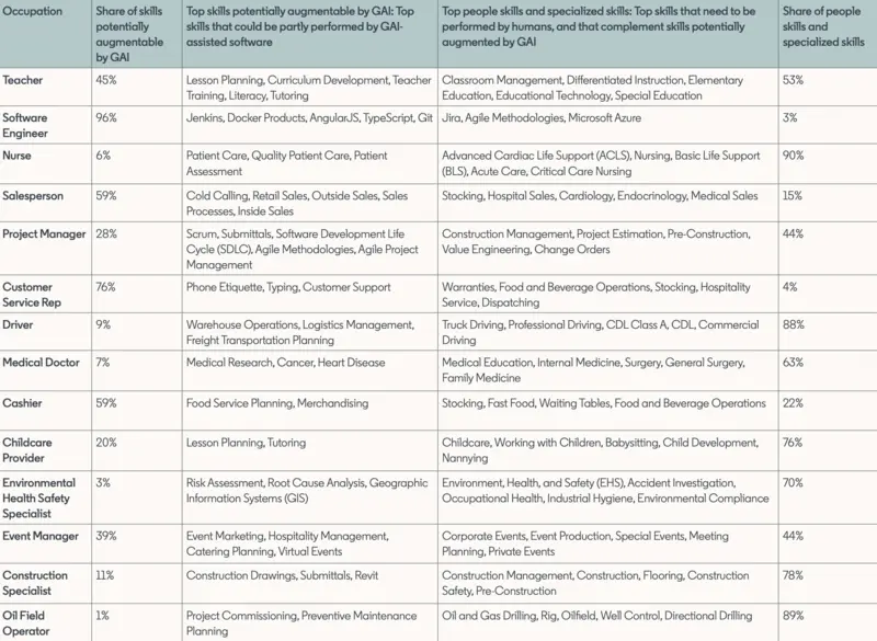 LinkedIn通过分析平台发现,最常见的职业中,软件工程师被AI取代的比例最高,高达96%,这意味着只有3%的技能需要软件工程师亲自执行。其他职业被AI取代的比例分别为:客服代表(76%)、收银员(59%)、店员(59%)、教师(45%)和活动经理(39%)。而油田操作员(1%)、环境健康安全专家(3%)、护理师(6%)和医生(7%)等职业技能被AI取代的机会最小。