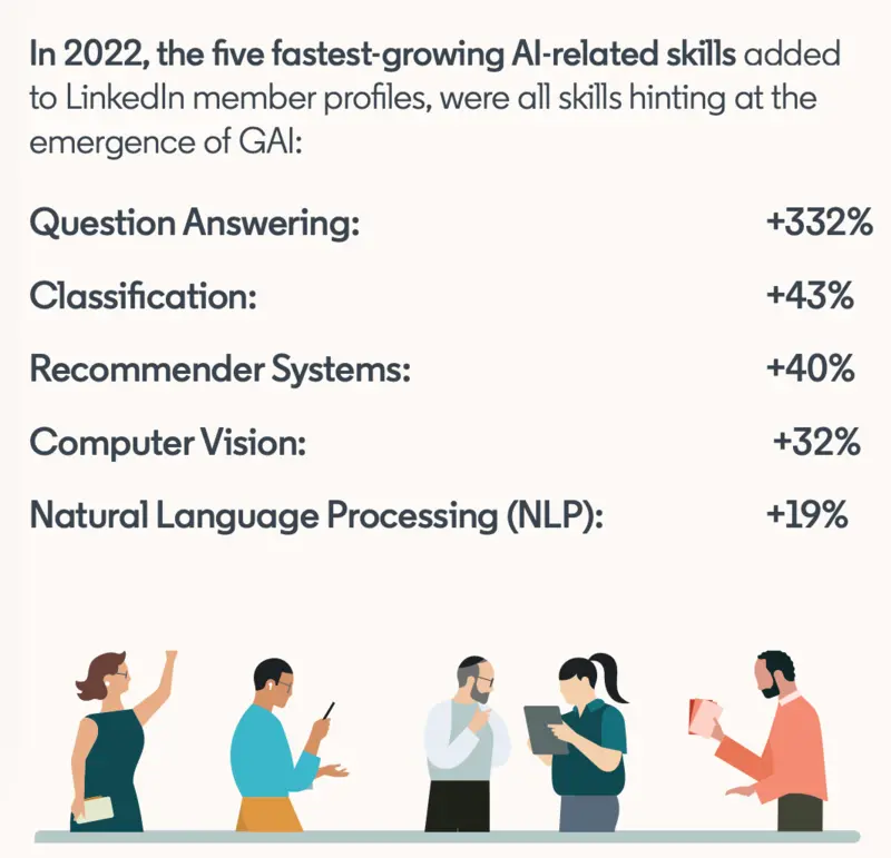 全球高达3亿个工作岗位受到AI和自动化的影响。2022年,LinkedIn基本数据中新增的五项增长最快的AI技能都与生成式AI有关,包括问答(成长率最惊人,达332%)、分类(43%)、推荐系统(40%)、计算机视觉(32%)及自然语言处理(NLP,19%)。