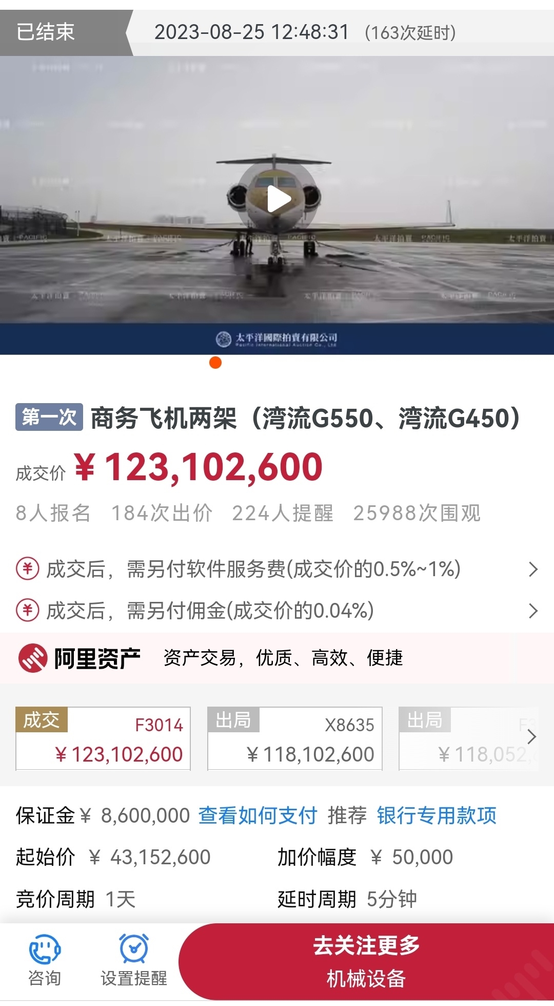 即便是这样的天价飞机,也有8人报名参加拍卖,而最终经过184次的出价,两架飞机最终以123,102,600元的价格成交,最终买家为代号“F3014”的阿里拍卖用户。
