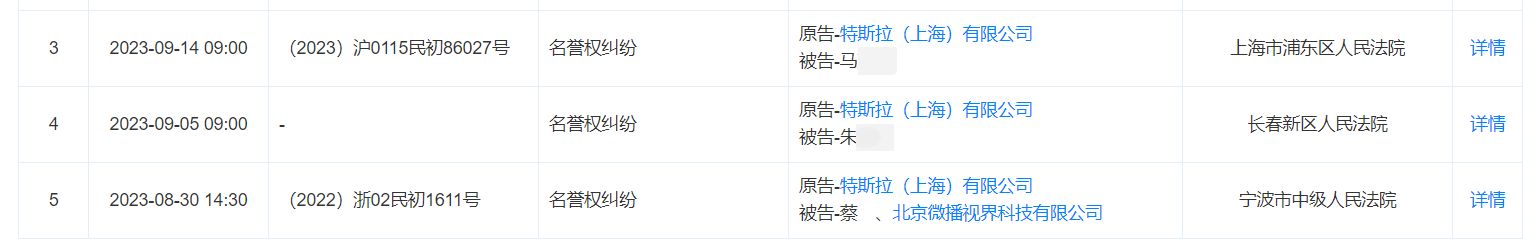 天眼查APP显示,特斯拉(上海)有限公司近日新增多个开庭公告,并且特斯拉均为原告,开庭案由也均为“名誉权纠纷”。其中,特斯拉起诉朱某某、马某某的案件,将分别于9月5日、9月14日开庭。而距离最近的开庭案件,则是特斯拉起诉“蔡甲”的案件,将于8月30日开庭。