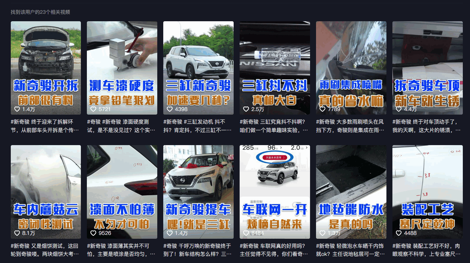 目前,该账号下仍有关于日产新奇骏“车漆薄,喷涂不均匀”、“线束无防护、新车部件生锈”、“新三缸奇骏车内抖动”等视频。