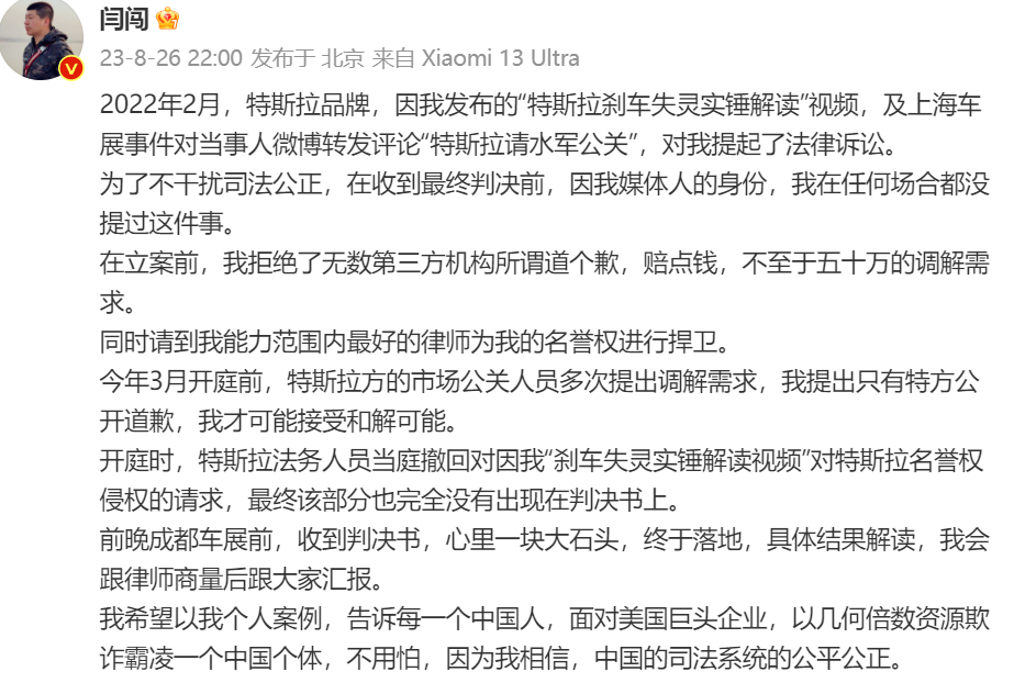 微博用户@闫闯有将近440万粉丝,是汽车KOL中的大V,他表示2022年2月,因为发布了“特斯拉刹车失灵实锤解读”视频,及上海车展事件对当事人微博转发评论“特斯拉请水军公关”,特斯拉对他提起了法律诉讼。