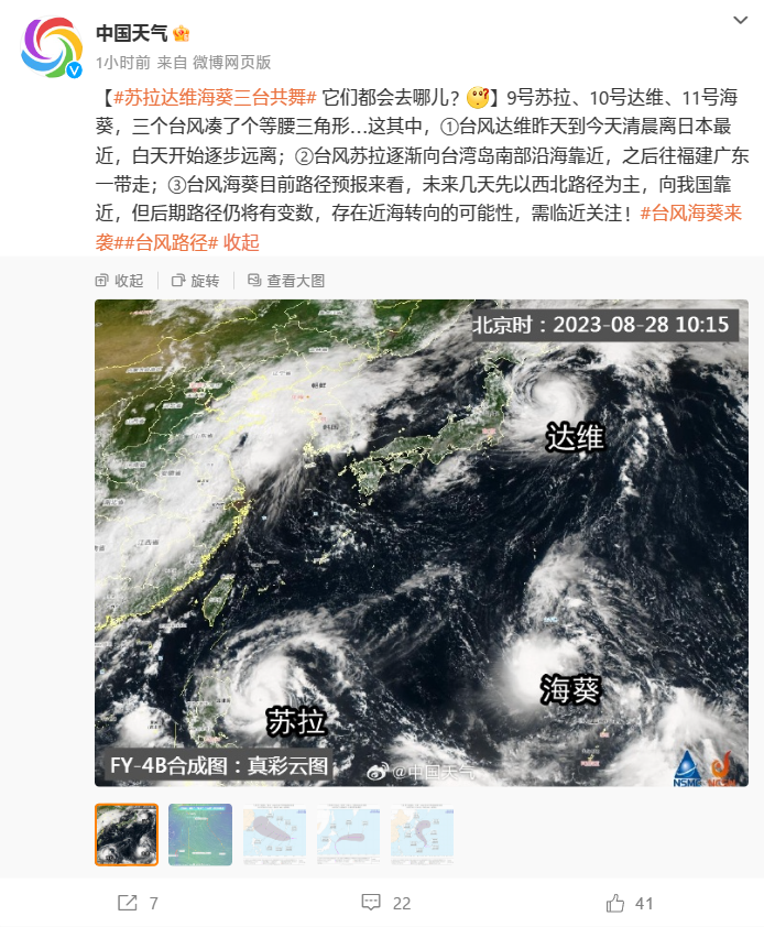 值得注意的是,目前西北太平洋上有“苏拉”、“达维”、“海葵”三个台风同时活跃,形成“三台共舞”。