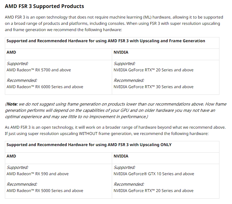 如果关闭帧生成技术,只用超分辨率缩放技术,RX 590系列、GTX10系列或更新的显卡都没问题,不过推荐至少使用RX 5000系列、RTX 20系列。