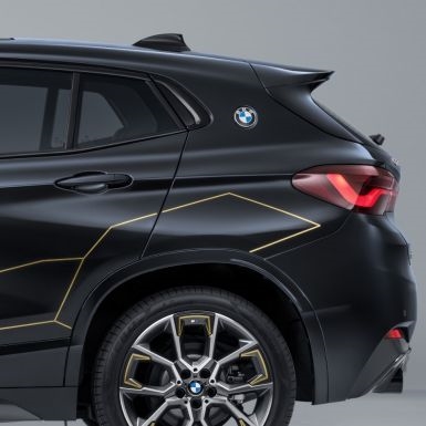 侧面来看,该车的外观与进口1系十分相似,采用双五辐设计,在C柱处还能看到内嵌式设计的宝马车标,算上车头、车尾、车内方向盘、四个轮毂处的车标,宝马X2全车一共有9个宝马车标。