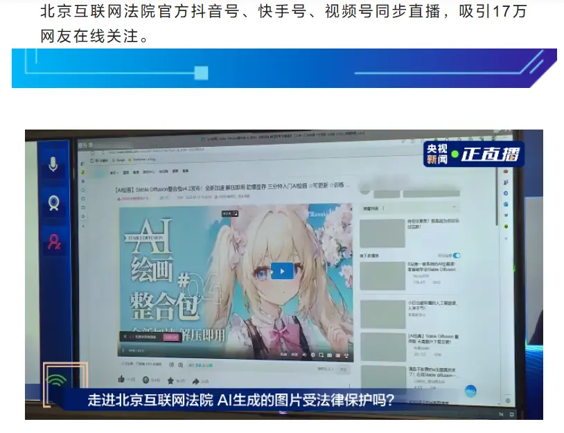 该案庭审过程由中央广播电视总台新闻中心进行全媒体直播,清华大学法学院知识产权法研究中心主任崔国斌教授、计算机图像算法工程师黄影元作为节目嘉宾,对 AI 生成内容涉及的技术与法律问题进行了讨论。节目在央视新闻客户端、新媒体平台及北京互联网法院官方抖音号、快手号、视频号同步直播。