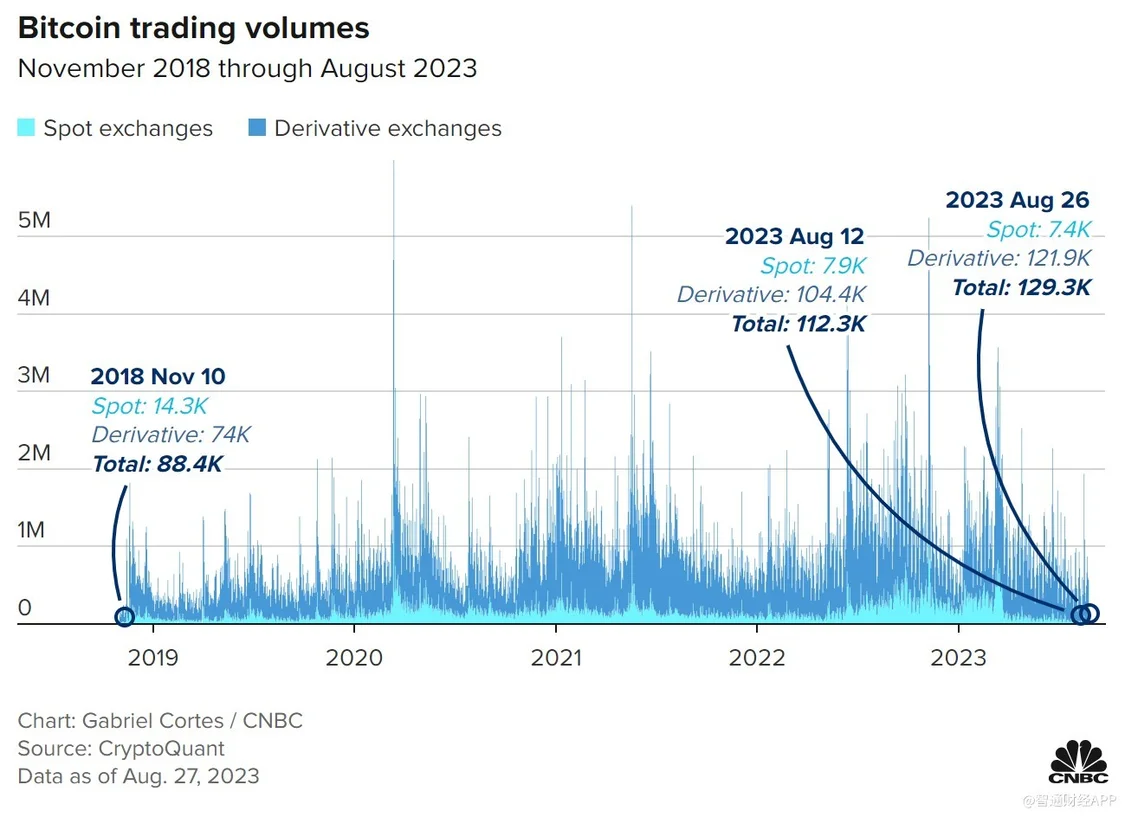 CryptoQuant的研究主管Julio Moreno在接受采访时表示:“在熊市中,交易量会减少,因为散户退出。2022年,大多数交易所都发生了这种情况。随着我们进一步进入牛市,交易量可能会继续上升。”