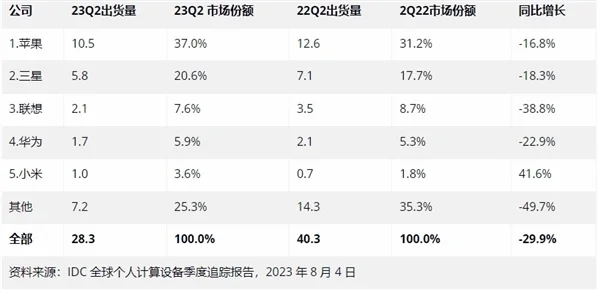 8 月初,IDC 陆续公布了几份最新的市场报告,其中智能手机和 PC 市场的下滑都在大幅缩窄,但与此同时,2023 年第二季度全球平板电脑市场出货量大跌 29.9%至 2830 万台。