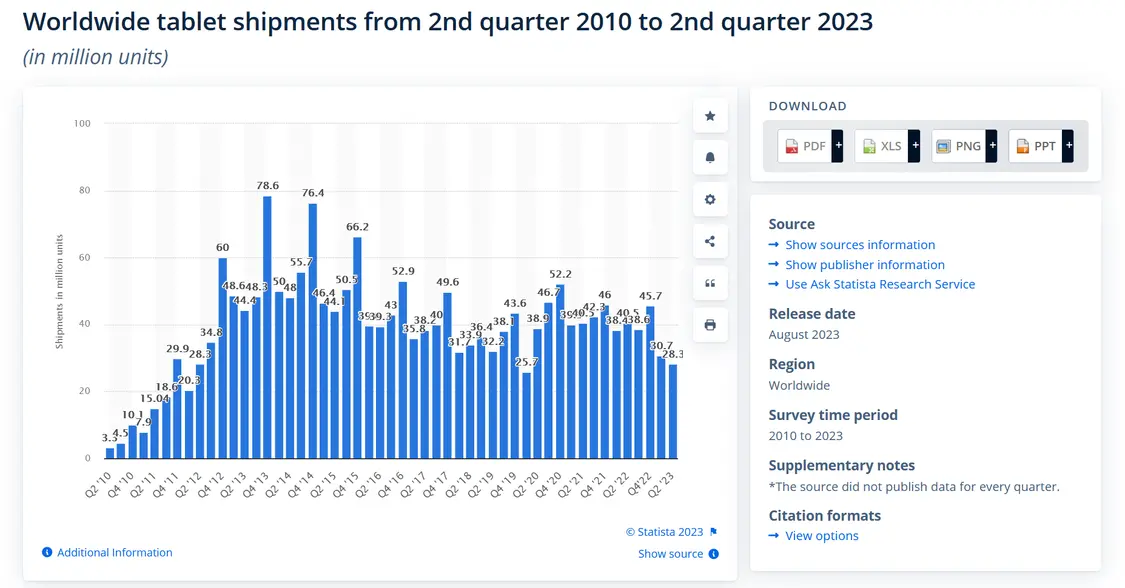 iPad 面世 13 年来平板电脑出货量,图/Statcounter