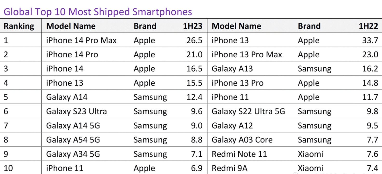 专业机构Omdia汇总市场数据,公布出了2023上半年(1-6月)全球销量最高的10款智能手机。分别是:iPhone14 Pro Max、iPhone14 Pro、iPhone14、iPhone13、三星Galaxy A14、三星Galaxy S23 Ultra、三星Galaxy A14 5G、三星Galaxy A54 5G、三星Galaxy A34 5G、iPhone11。