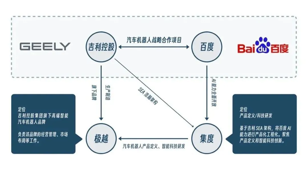 2021年3月,百度与吉利共同出资成立集度汽车,由百度占股55%,吉利占股45%,据说“集度”这个品牌名还是由百度AI给取的。但是两年之后,集度汽车的官网已经悄悄变成了极越汽车机器人。