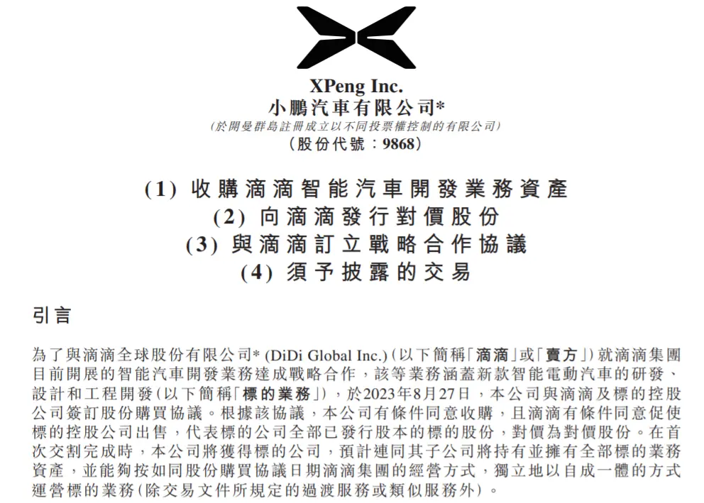 继百度之后,滴滴的造车计划也开始出现了方向性的变化。8月28日,小鹏汽车发布公告称,以最高对价港币58.35亿港元的价格,收购滴滴智能汽车开发业务资产。这是一笔不涉及现金的交易,小鹏通过增发股份的方式来收购滴滴资产,滴滴则通过出卖资产获得小鹏汽车的股份。