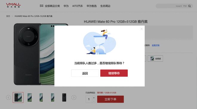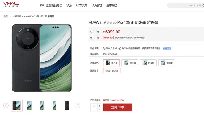 华为商城显示,有雅丹黑、雅川青、白沙银、南糯紫四种颜色可以选择,版本12GB+512GB可以选择,售价6999元。目前已经处于排队状态。