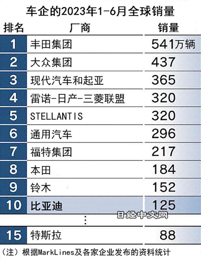 值得关注的是,全球车企销量榜中,也首次出现了中国车企的身影,比亚迪2023年上半年全球新车销量同比增长96%至125万辆,超过德国梅赛德斯奔驰和德国宝马,首次进入全球前十。
