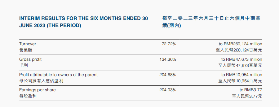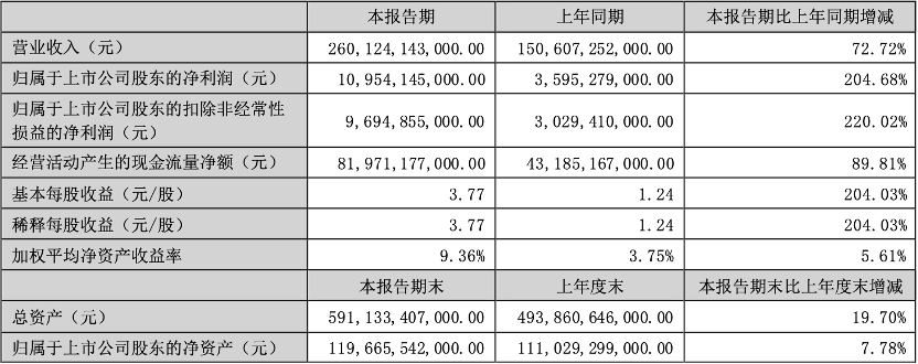 归母净利润则为109.54亿元,同比暴涨204.68%,扣非后的净利润也达到了96.95亿元,同比增长220.02%,每股实现收益3.77 元。