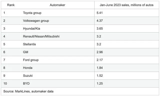 数据显示,前十名分别为丰田(541万辆)、大众(437万辆)、现代汽车和起亚(365万辆)、雷诺-日产-三菱联盟(320万辆)、Stellantis(320万辆)、通用(296万辆)、福特(217万辆)、本田(184万辆)、铃木(152万辆)和比亚迪。