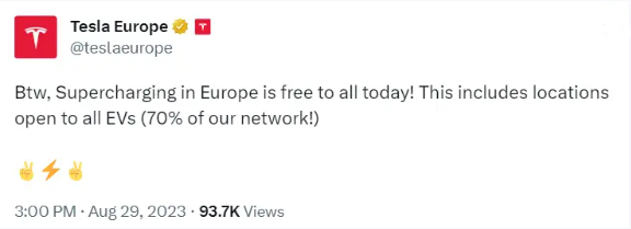 日前,我们从特斯拉欧洲官方获悉,为了庆祝特斯拉超充站入驻欧洲十周年,特斯拉宣布,8月29日将向所有特斯拉和非特斯拉用户提供免费充电服务。特斯拉补充道:如果你在欧洲,今天就可以在所有特斯拉超级充电站免费充电。据悉,10年前的今天,首批6个超级充电站在挪威开业。