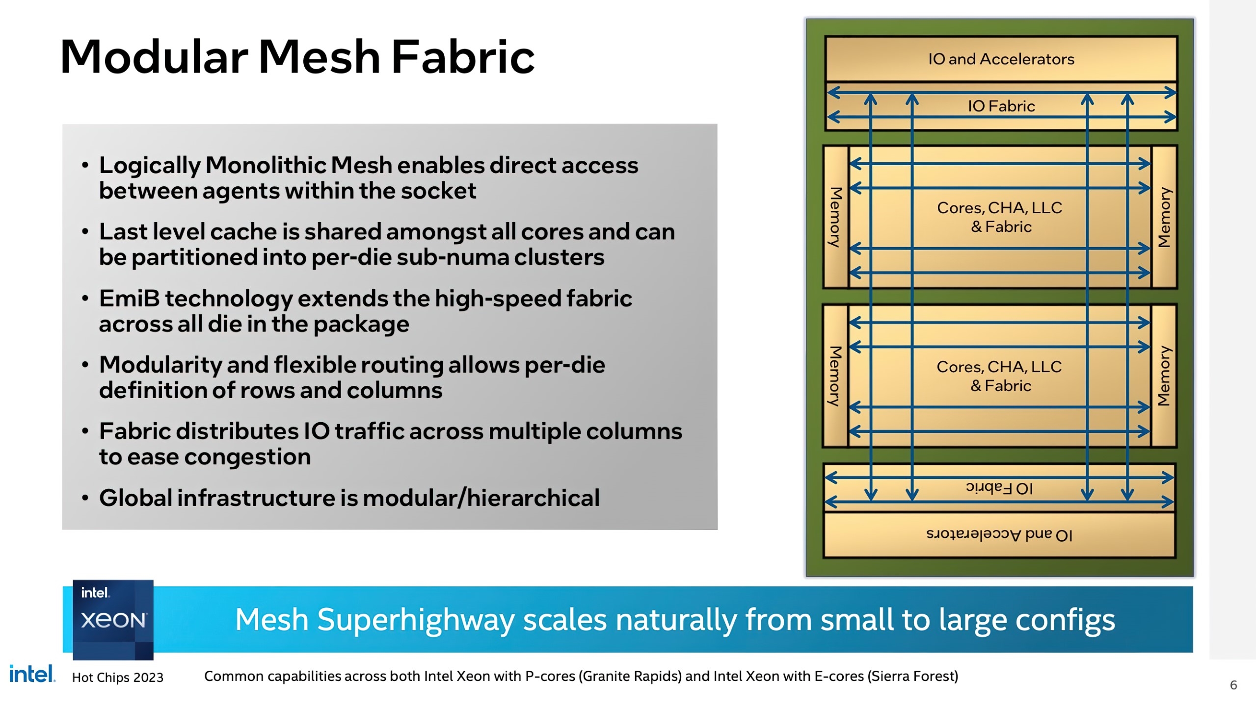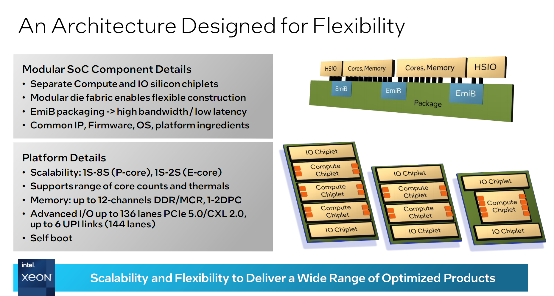 Sierra Forest、Granite Rapids新至强都采用了模块化SoC设计,一是包含处理器核心、内存的计算模块,二是负责输入输出的IO模块,彼此分离,再结合EMiB封装、网格互连接口(mesh fabric interface),可以灵活组合、扩展。