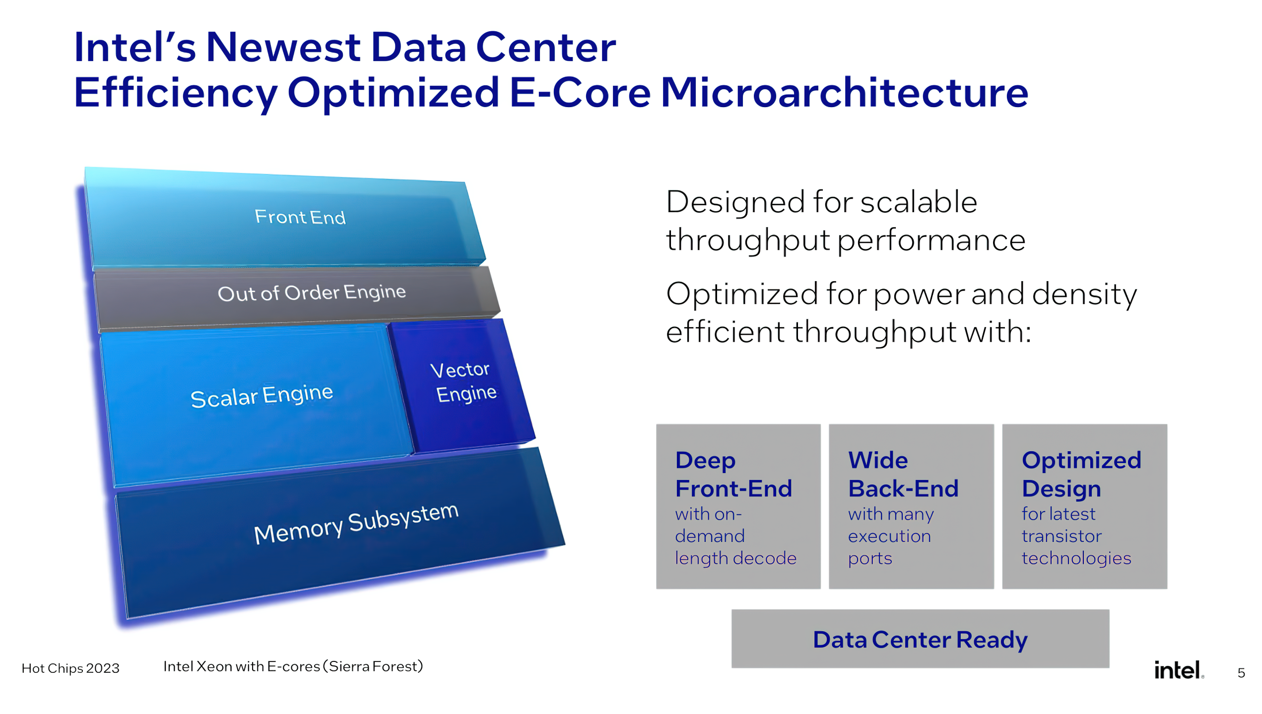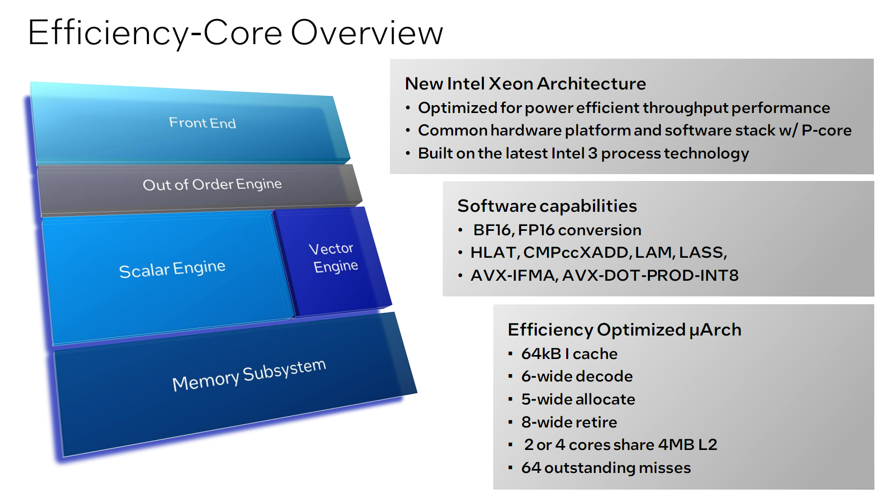 E核是全新设计的架构,前端、乱序引擎、标量引擎、矢量引擎、内存子系统等规格模块都针对能效进行特别优化,同时与P核共享硬件平台、软件堆栈,还会用上先进的Intel 3制造工艺。