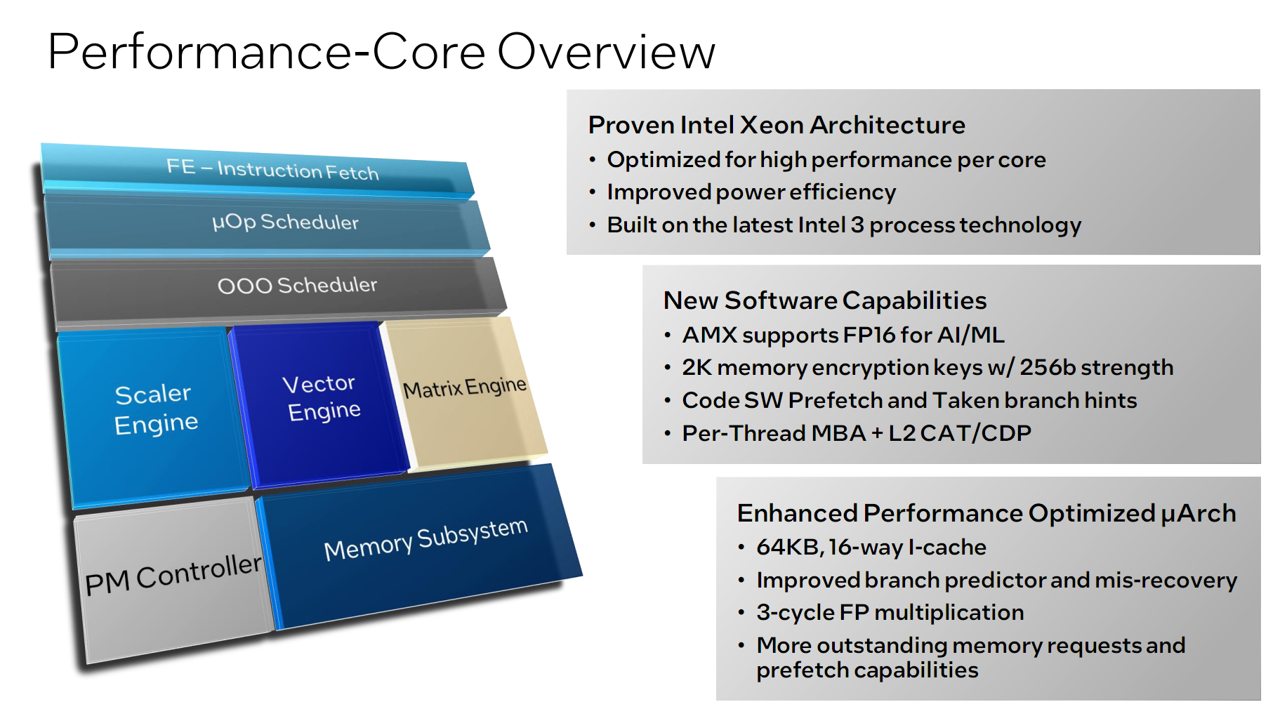 每个P核具备64KB 16路一级指令缓存,支持增强型AMX指令、新的FP16浮点指令,号称混合AI负载性能提升2-3倍。