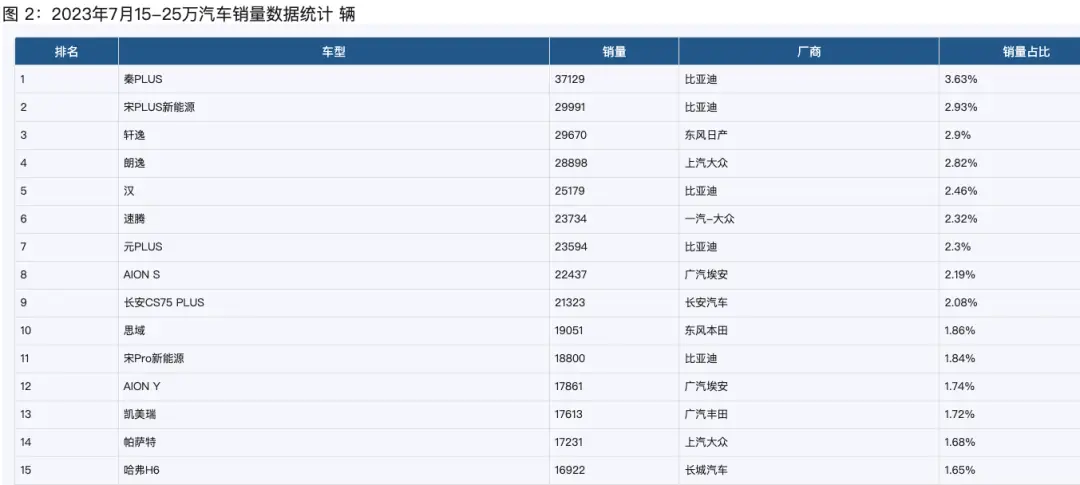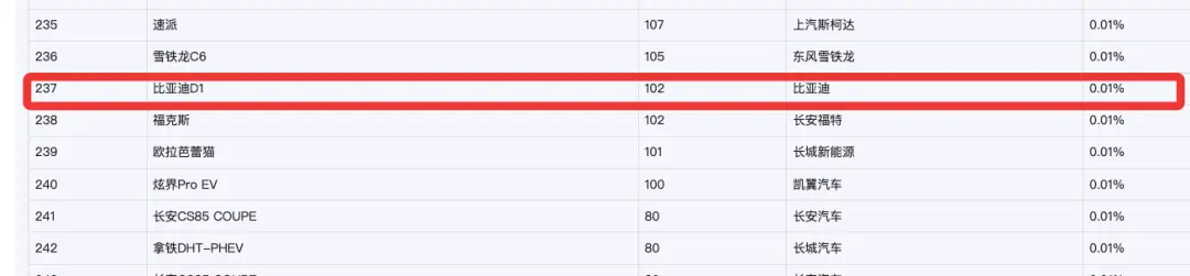 在2023年7月份乘用车销量数据中,D1共售出102辆新车,环比下降25.55%,占比亚迪当月总销量的0.07%,在15万-25万汽车销量排行中,位列第237位。