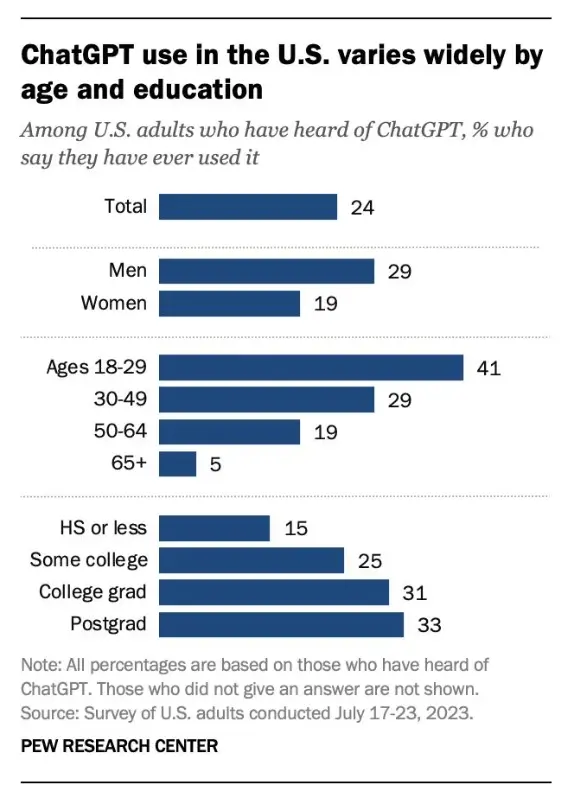 根据皮尤研究中心最近的一项调查,ChatGPT的使用和担忧没有像想象的那么广泛。只有18%的美国人使用过ChatGPT。最常使用它的群体是18-29岁受过大学教育的男性,但即便如此,使用率也只有30-40%。