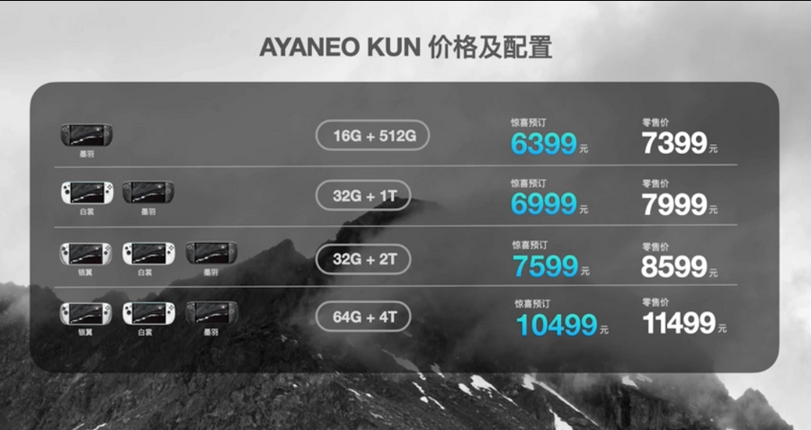 Ayaneo Kun 的定价为 16G 内存 + 512G硬盘惊喜预订价 6399 元起,32G +1T 预订价 6999 元,32G +2T 预订价 7599 元,64G + 4T预订价 10499 元。零售价格则均高 1000 元。这款掌机还将于 9 月 5 日开启海外众筹。
